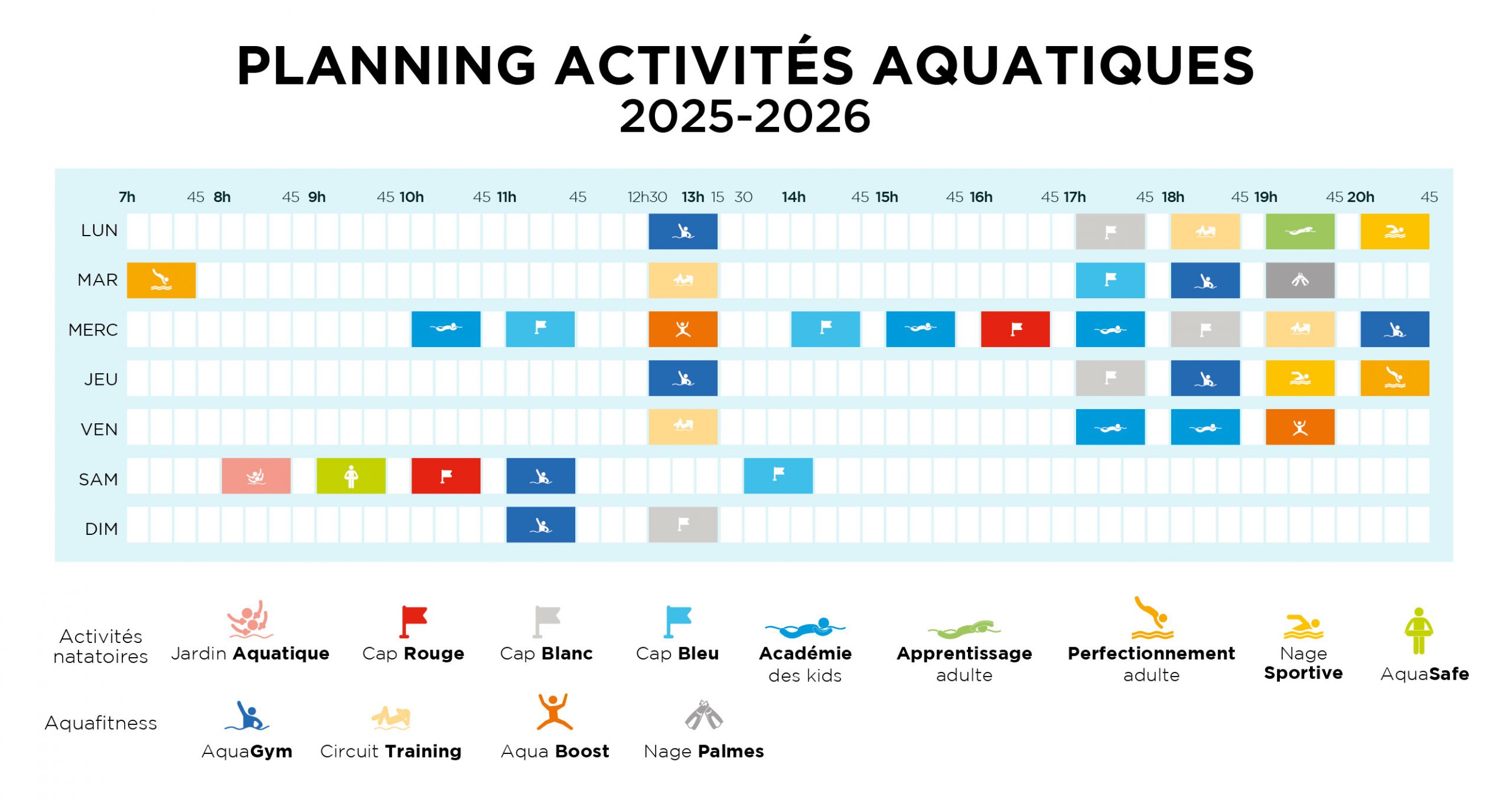 PLANNING ACTIVITÉS Télécharger le planning Aquatiques ACTIVITÉS ADULTES APPRENTISSAGE PERFECTIONNEMENT NAGE SPORTIVE AQUAGYM CIRCUIT TRAINING NAGE PALMES AQUA BOOST ACTIVITÉS ENFANTS CAP ROUGE CAP BLANC CAP BLEU JARDIN AQUATIQUE ACADÉMIE DES KIDS